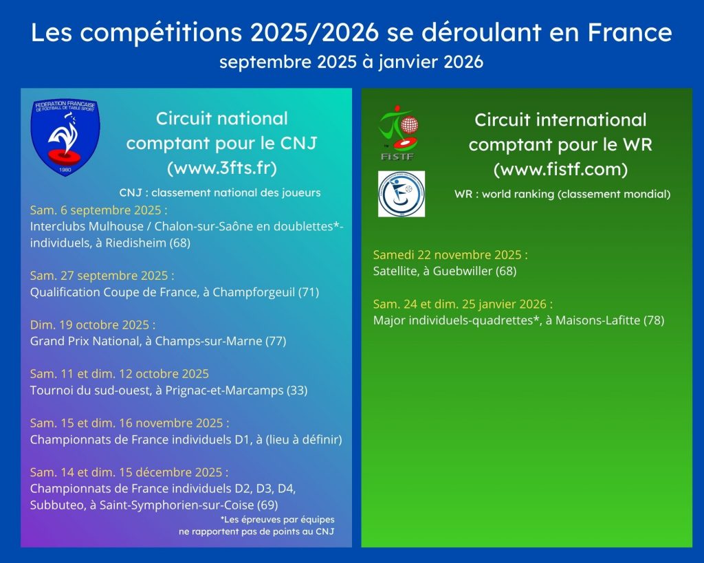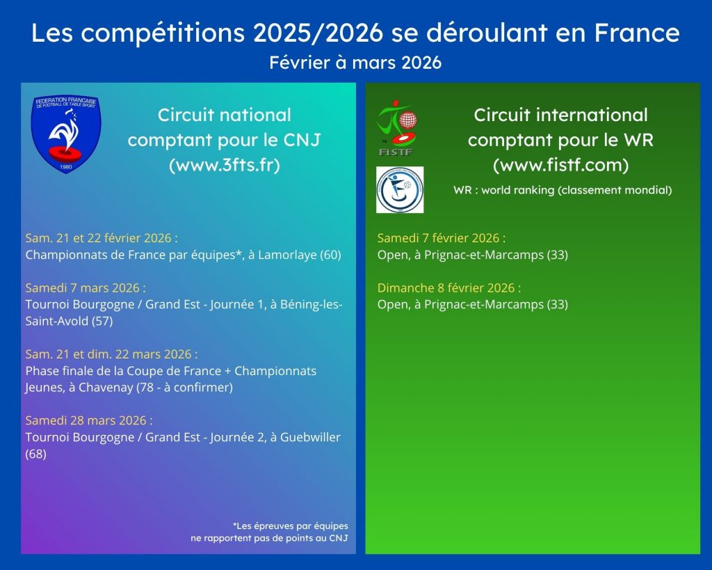 Votre tournoi n’apparait pas ? Pour tout ajout d’une épreuve pour laquelle vous avez obtenu une homologation 3FTS et/ou FISTF, envoyez date, nom du tournoi, son type d’homologation (Tournoi local, tournoi fédéral, GPN,…) et lieu, à footballdetableinfos@gmail.com (cette requête est indépendante de vos démarches administratives pour la validation de votre compétition auprès du Conseil fédéral de la 3FTS).