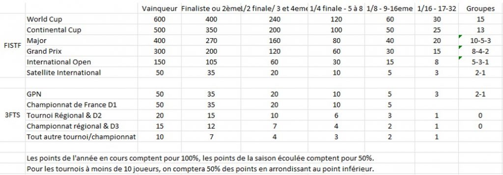 – le classement brut : la position, l’identité du joueur et son nombre de points (cumul des points sur le circuit français 3FTS et sur le circuit international FISTF);